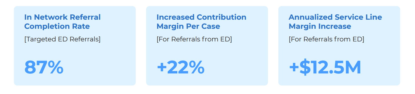 The health system monitored granular data for each service line, measuring the in-network completion rate for high-priority patient referrals. Baseline data was created for downstream utilization of Outpatient, Inpatient and Surgical services within 120 days from ED discharge. The health system saw meaningful growth in utilization rates and margin for high-priority referrals that received targeted navigation outreach.
