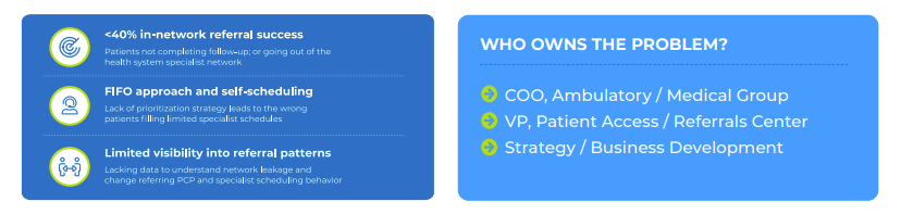 Care Continuity partnered with a regional health system with a growing footprint in multiple markets across two states. The organization had built a medical group network of more that 900 physicians including PCP and specialist providers - along with a Clinically Integrated Network (CIN) of more than 2,000 affiliated providers. To manage specialist referrals the health system had recently centralized its Patient Access team, and also rolled out new self-service scheduling tools in some markets – but they still struggled to match the right patients with the priority specialist appointment slots.