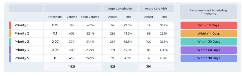 The health system had basic work queues in their EHR for referral scheduling, but more than 90% were marked as “routine” and followed a “first-in-first-out” prioritization based on referral date. Partnering with Care Continuity, they implemented a referral scoring model for the new Patient Access Center to prioritize the rolling backlog of more than 50,000 specialist referrals. This enabled navigation staff to work smarter and schedule more high-priority patients with in-network specialists - reducing network leakage and improving downstream revenue