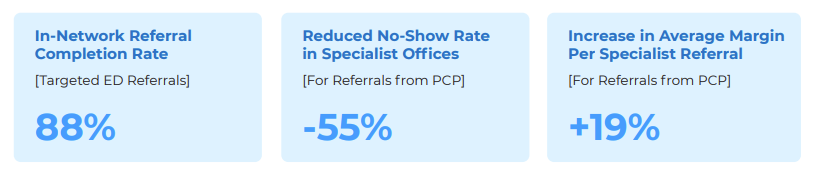 The health system monitored referral patterns for every PCP and Specialist practice and measured in-network completion rates for high-priority patient referrals. To better understand their own provider network, they also tracked appointment wait times and no-show rates for every specialist office. By focusing on high-value referrals, the system saw growth in downstream utilization rates and realigned their provider network relationships to reduce revenue leakage to competitors in each market. Ultimately, their owned medical group saw a better mix of high-priority patients and optimized their limited appointment capacity.